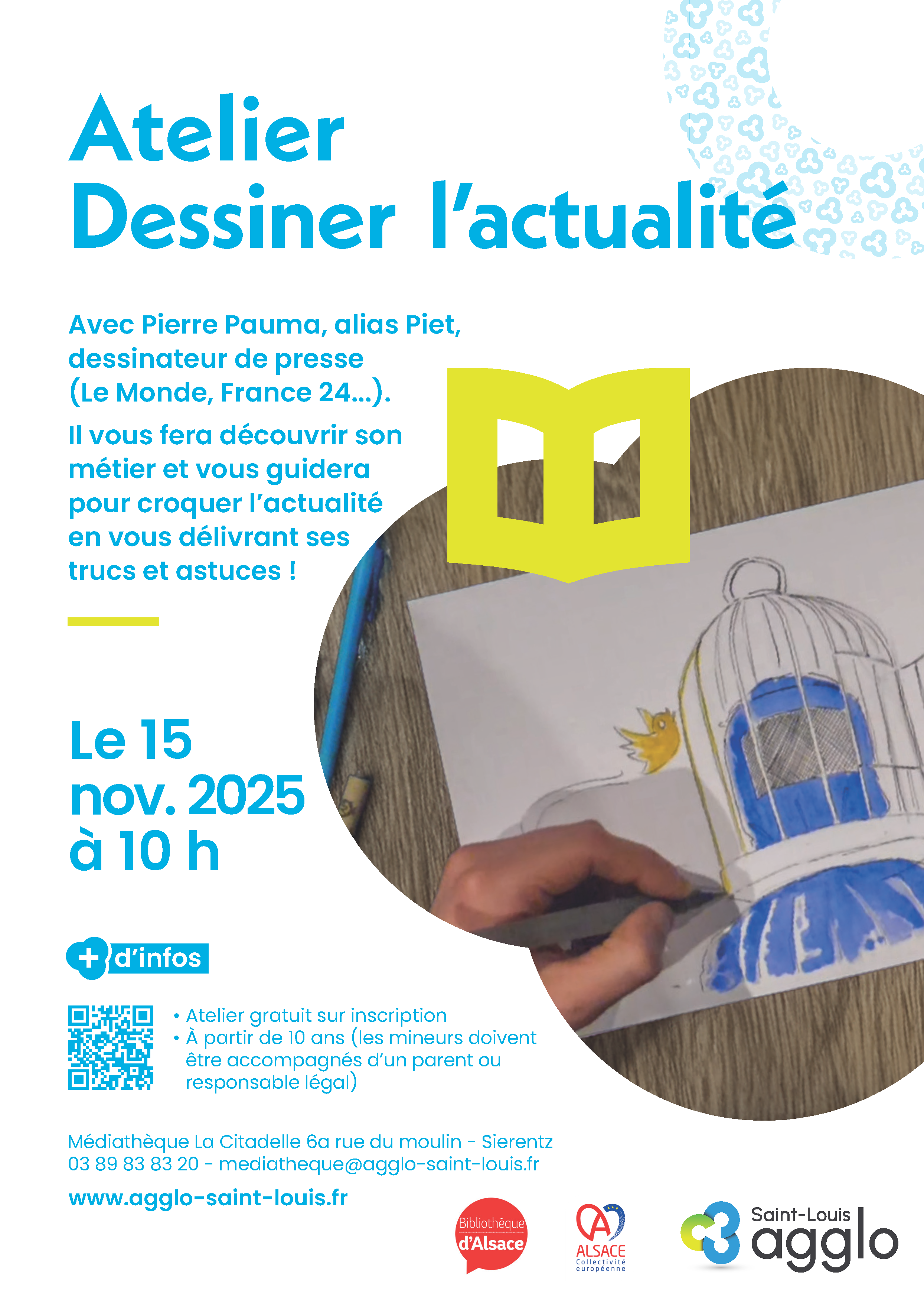 La médiathèque intercommunale La Citadelle à Sierentz vous invite à un atelier Dessiner l’actualité avec Pierre Pauma, alias Piet, dessinateur de presse (Le Monde, France 24…) le samedi 15 novembre à 10 h.