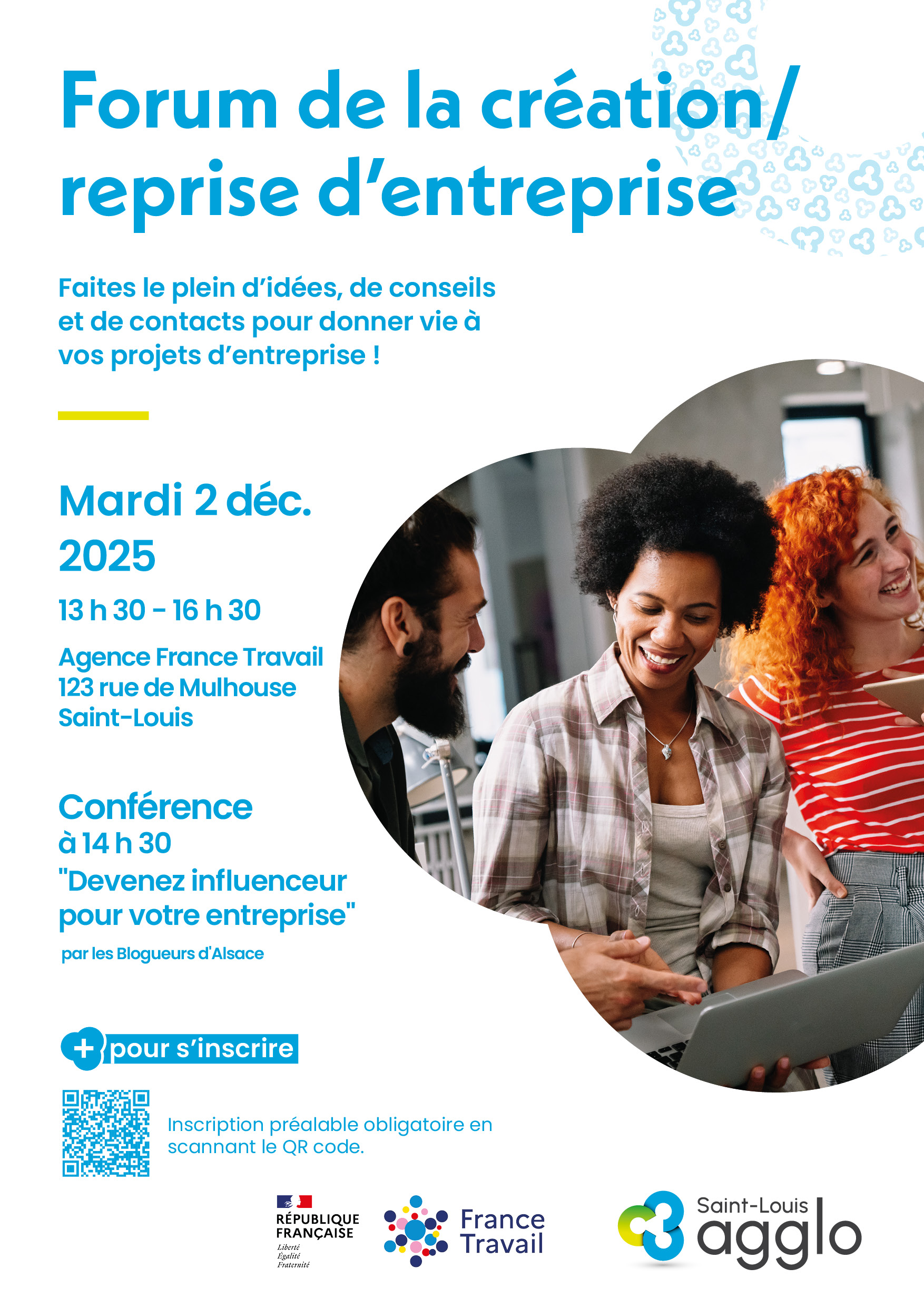 Saint-Louis Agglomération vous propose en partenariat avec l’agence France Travail de Saint-Louis, le « Forum de la création/reprise d’entreprise » le mardi 2 décembre 2025.