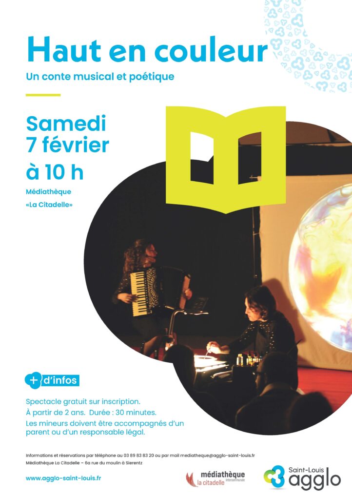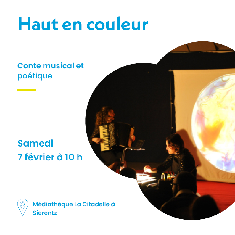 La médiathèque intercommunale La Citadelle à Sierentz propose un conte musical et poétique intitulé “Haut en couleur” pour les tout-petits. Quoi de mieux qu’un grenier pour faire place à l’imaginaire ? Quand un filet de lumière à travers la lucarne se transforme en étoile filante, alors, tout devient possible. C’est le point de départ de ce spectacle, parenthèse poétique, où notre âme d’enfant se retrouve à voyager dans un univers coloré ! Une ritournelle à l’accordéon et le rétroprojecteur s’allume !