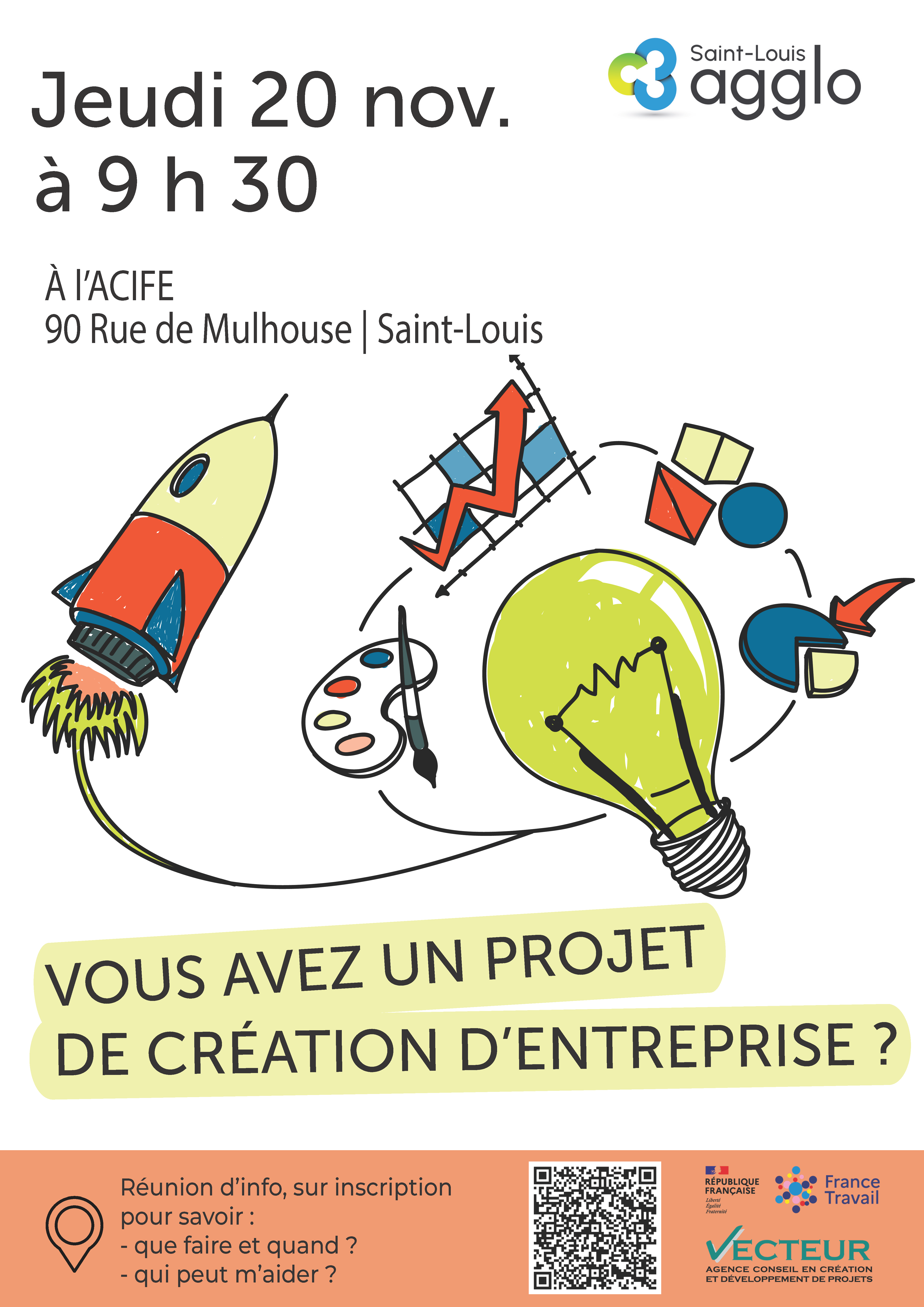 Saint-Louis Agglomération propose en partenariat avec France Travail et l’agence Vecteur, spécialisée dans le conseil généraliste à la création d’entreprise, une réunion d’information « Création d’entreprise » le jeudi 20 novembre 2025 de 9 h 30 à 12 h dans les locaux de l’Acife, 90 rue de Mulhouse à Saint-Louis.