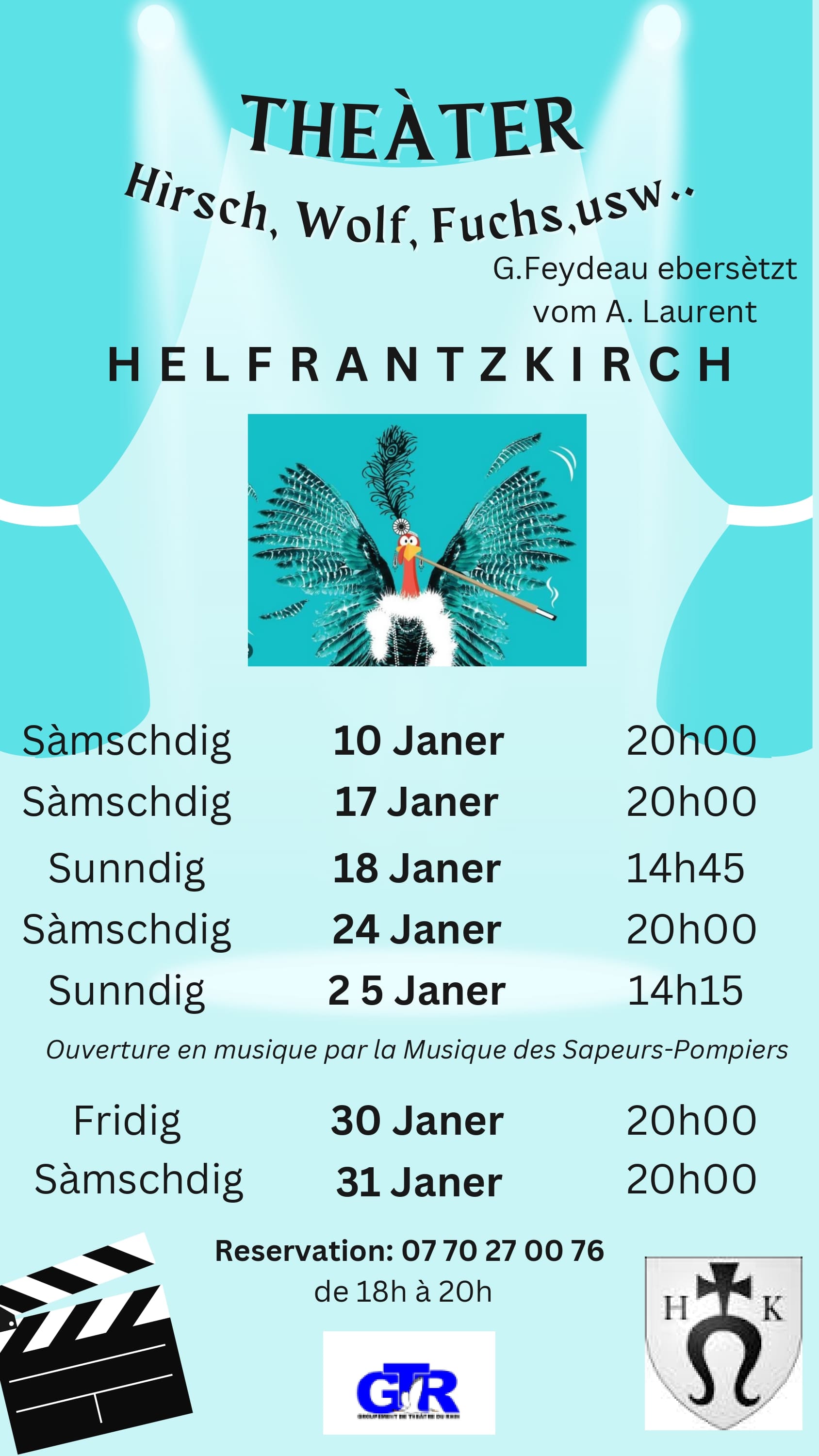 À partir du 10 janvier 2026, la troupe théâtrale de Helfrantzkirch présentera sa nouvelle pièce en alsacien « Hìrsch, Wolf, Fuchs, usw.. », une adaptation de Georges Feydeau réalisée par A. Laurent.