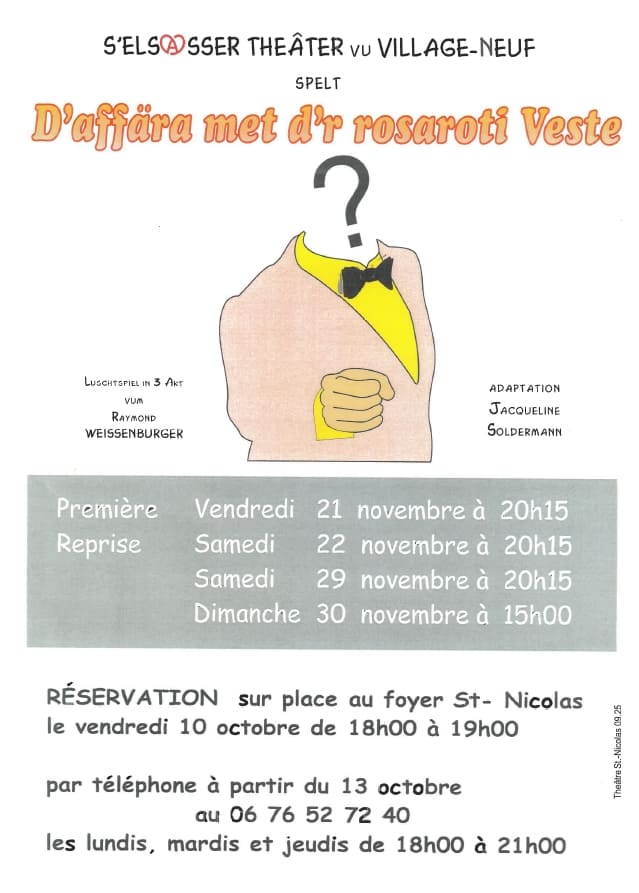 À partir du 21 novembre 2025, le S’Elsasser Théàter vu Village-Neuf présentera sa nouvelle comédie en alsacien « D’affàra met d’r rosaroti Veste », une pièce en trois actes de Raymond Weissenburger, adaptée par Jacqueline Soldermann.